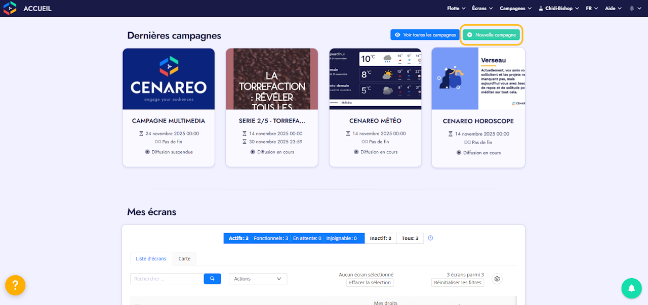 Chez Cenareo, une campagne est définie comme un ou plusieurs médias, associés à un ou plusieurs écrans et associés à un planning de diffusion.