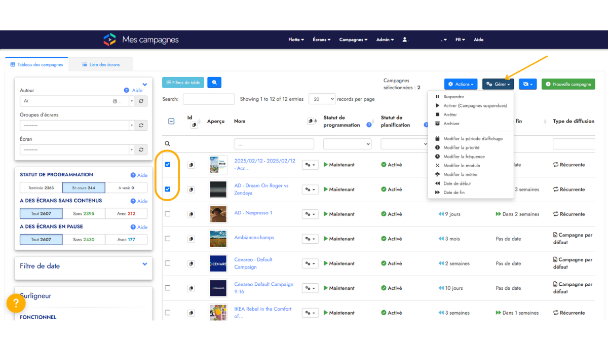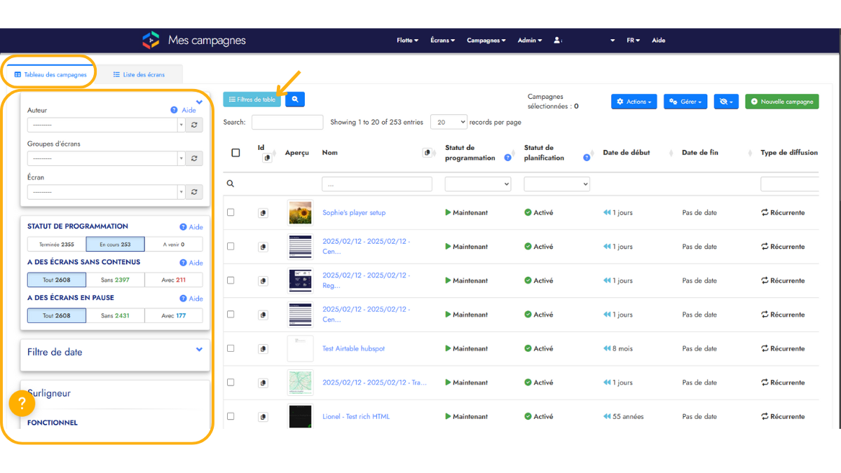The Table View lists all the campaigns that you have access to. You have access to all campaigns of which you are the author OR which are broadcast on one of the screens you control. Here are the key elements to manage your campaigns.
