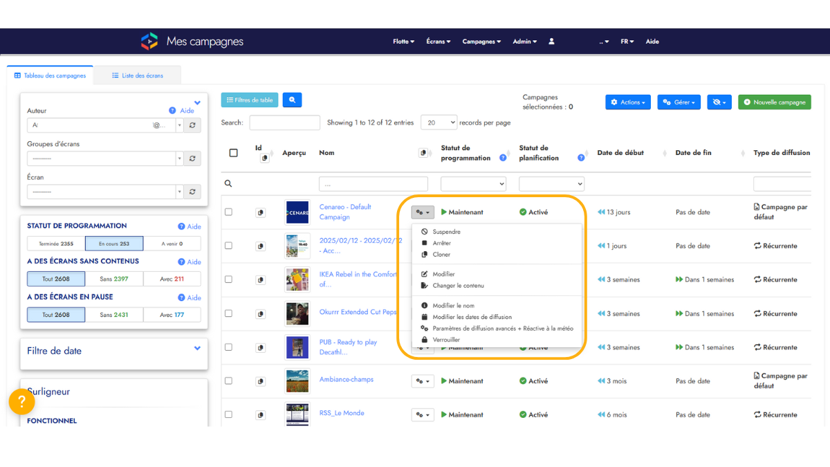 The Cenareo solution allows you to control communication on your screens through campaigns. All your campaigns can be found in the “Campaigns” tab of your Cenareo space. You can manage them through the Table View or Calendar View.