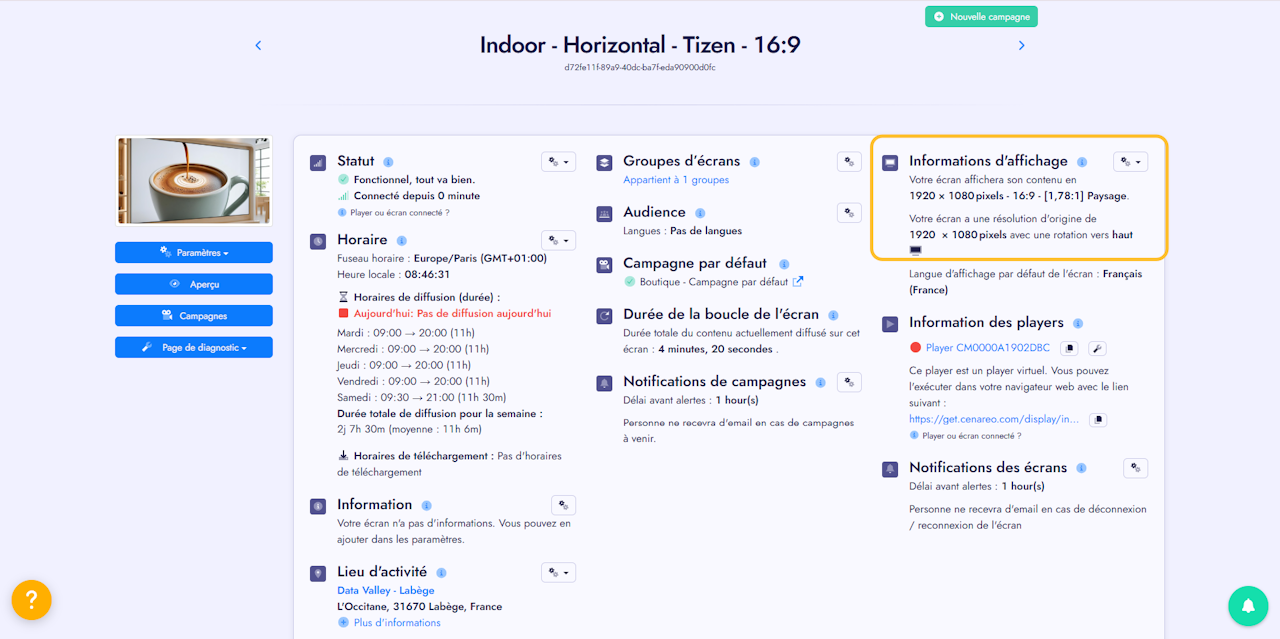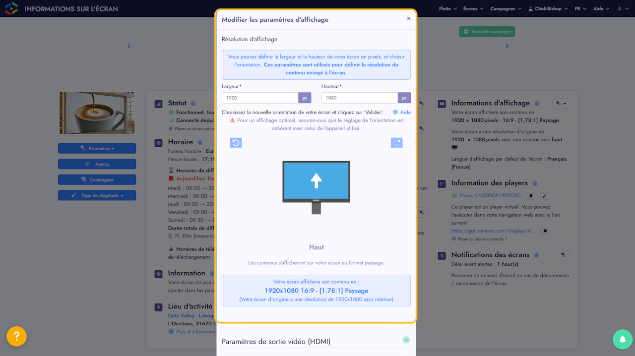 The orientation (or rotation) of the display on the screen is set directly from the Cenareo platform. The settings you have entered are sent to the player, which will adapt the display accordingly. To set a player’s orientation, go to the screen page, click on “Settings” and then “Change orientation”.